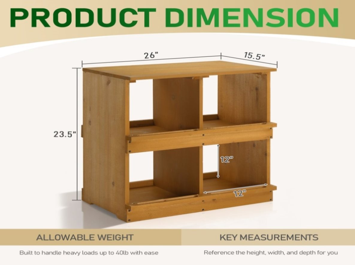 1. Durable Weather-Resistant Wood: Crafted from high-quality fir wood, this nesting box withstands outdoor conditions and ensures long-term use in chicken coops or backyard environments.