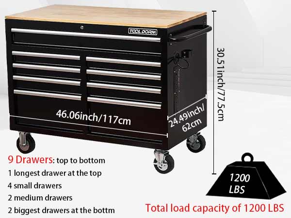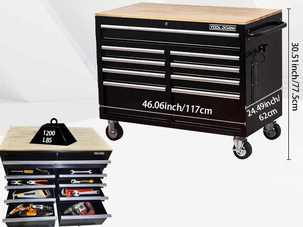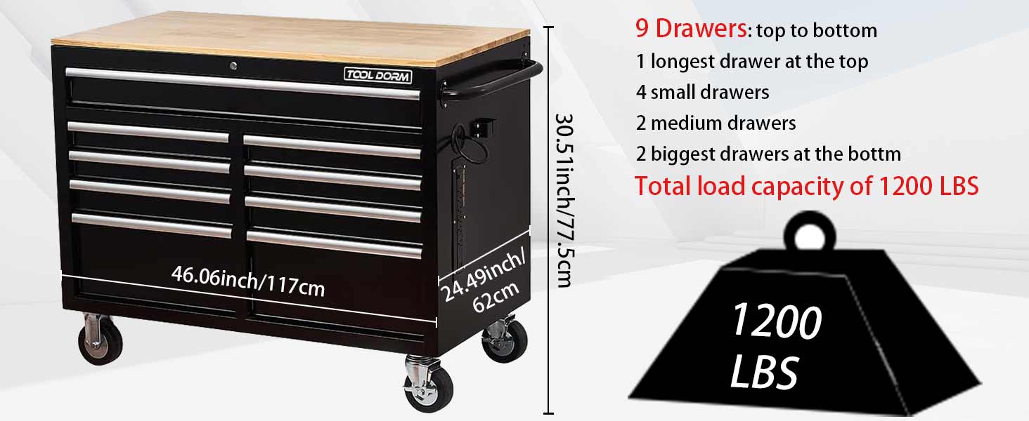 Max 1200 lbs Load Capacity Constructed with high-quality welded steel construction, anti-rust treatment and corrosion-resistant powder coat finish, featuring a solid-wood surface on top, this tool chest is a great garage tool chest or workbench that fits just as easily in the home shop and other repair shop.