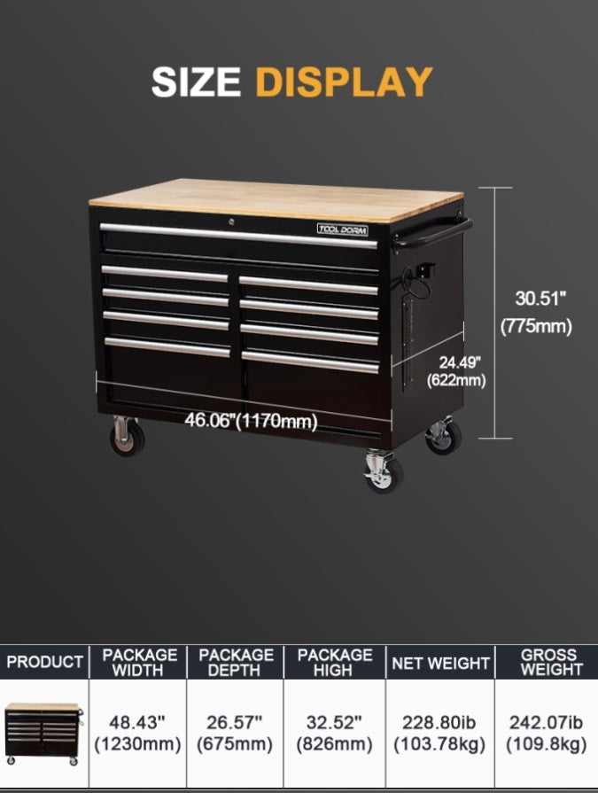 Extra-Deep 46In 9-Drawers Rolling Tool Chest, Mobile Tool Storage Cabinet/Work Bench with Wooden W3037P288786