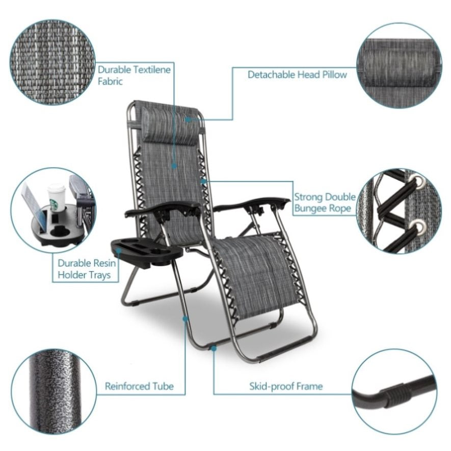 These anti-gravity chairs set of 2 are perfect for relaxing on the patio, at the beach or reclining outdoors in the yard. Designed with comfort in mind, these reclining lounge chairs are made from all-weather fade-resistant textilene sling fabric. The bungee cords that connect the textilene seat to the sturdy steel frame help to enhance the comfort and function of the chair.Features:
