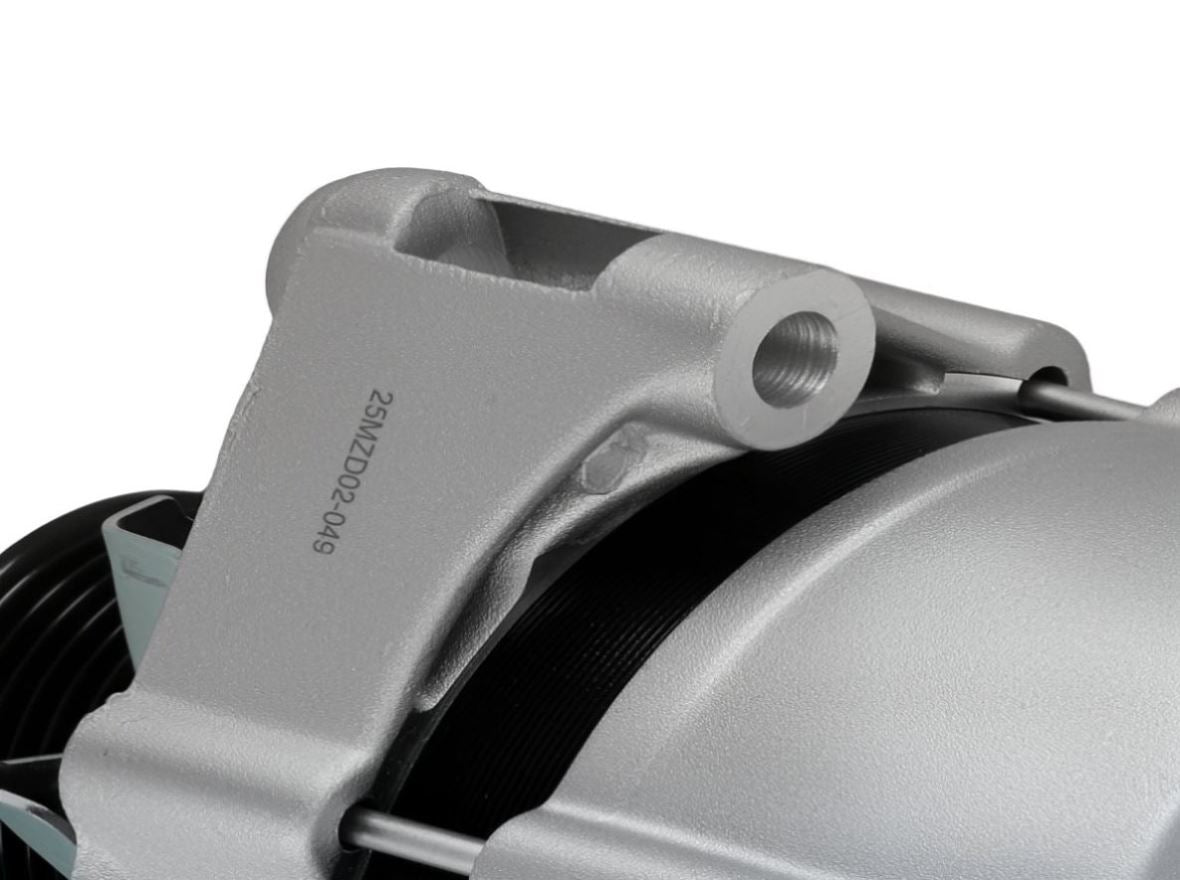 * Type: Spool Mtg Ear 1 Hole: M8x1.25 Threaded Mtg Ear 2 Hole: 10mm Unthreaded Mtg Ear 1 Thickness: 0.63in / 16mm Mtg Ear 2 Thickness: 1.988in / 50.5mm Regulator Clock: 9:00 Fan Location: External Regulator Location: Internal B+ Terminal: M8x1.25 D+ Terminal: M5x0.8 W Terminal: Spade Polarity: Negative Shaft OD (Pulley): 0.669in / 17mm Shaft Threads: M16x1.50