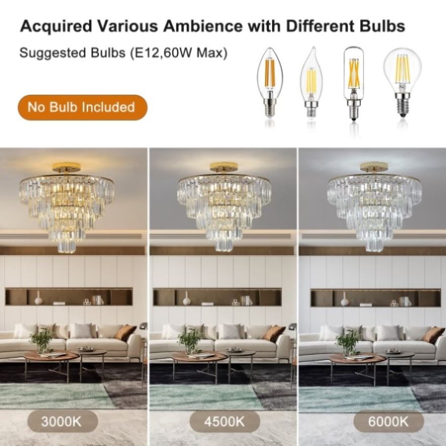 Bulb requirements -Modern ceiling chandeliers use 10 x E12 bulbs, compatible with dimmable bulbs, energy-saving bulbs, LED bulbs, Halogen lamp, etc.(Excluding)
