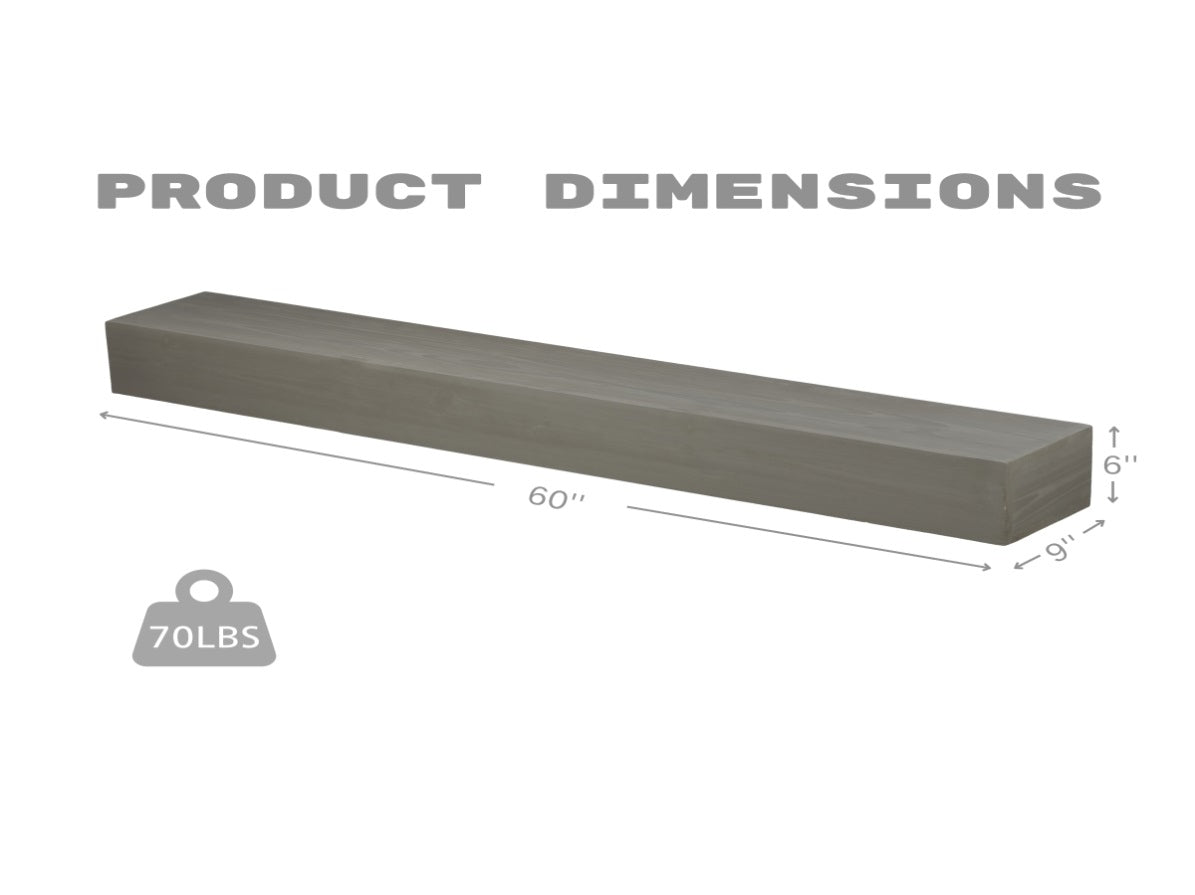 Product Dimensions Assembled Length (in.):60.00 Assembled Width (in.):9.00 Assembled Height (in.):6.00 Product Weight (lbs.):16.53 Wood Type:Fir wood Loading Capacity:70 LBS Package Size Length (in.):62.60 Width (in.):11.02 Height (in.):7.09 Weight (lbs.):21.61 Product Features SOLID WOOD MATERIAL: Wood Fireplace Mantel is made of fir wood; Flat surface with water-based coating;...