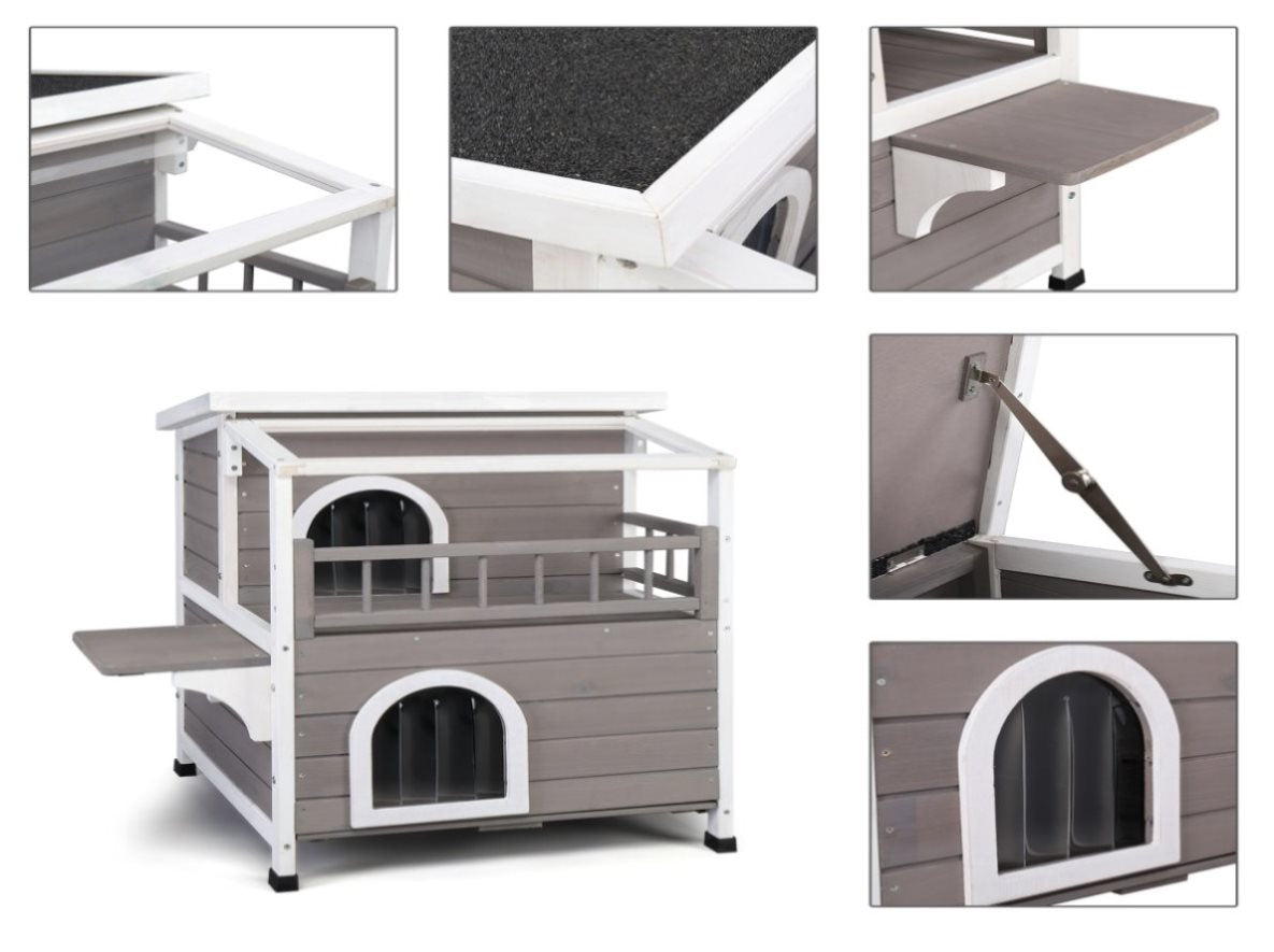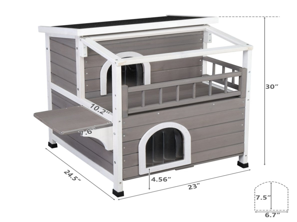 This wooden pet home with balcony with Transparent Canopy provides small pets with a secure and relaxed environment that can be used both indoors and out. Constructed using weather-treated non-toxic fir wood means and waterproof asphalt roof, this adorable home will endure years of use with very little maintenance. Its functional design allows pets to lounge comfortably on the balcony,or retreat inside the spacious condo sleep and play for the perfect get-away. The elevated foundation, with removable floor, promotes air circulation and protects your pet from ground chill and wet conditions. This stylish cat shelter is suitable for your backyard, patio, living room and other places.